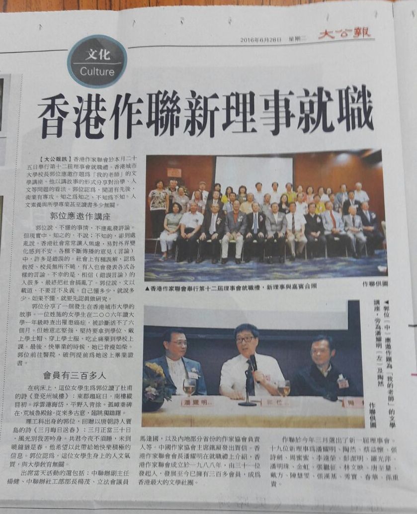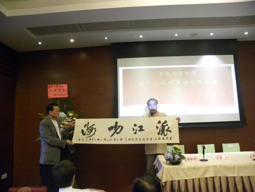 出席當天活動的還包括:中聯辦副主任楊健、中聯辦社工部部長楊茂、立法會議員馬逢國,以及內地部分省份的作家協會負責人等。中國作家協會主席鐵凝發出賀信。香港作家聯會會長潘耀明在就職禮上介紹,香港作家聯會成立於一九八八年,由三十一位發起人,發展至今已擁有三百多會員,成為香港最大的文學社團。