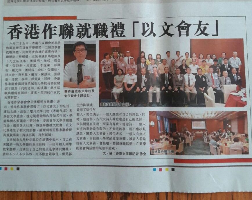 【大公報訊】香港作家聯會於本月二十五日舉行第十二屆理事會就職禮。香港城市大學校長郭位應邀作題為「我的老師」的文學講座。他以講故事的形式分享對治學、人文等問題的看法。郭位認為,聞道有先後,術業有專攻。知之為知之,不知為不知。人文素養與所學專業甚至讀書多少無關。